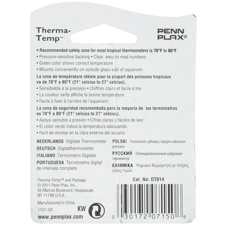 Most tropical fish have specific temperature requirements in order to thrive. The Penn-Plax AquaLIFE Therma-Temp Digital Aquarium Thermometer makes it easy to know exactly what temperature your aquarium is at. This thermometer mounts conveniently on the outside wall of your aquarium with a pressure-sensitive backing. The numbers are clear and easy to read as the green color shows the correct temperature.