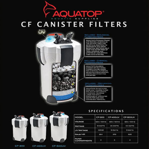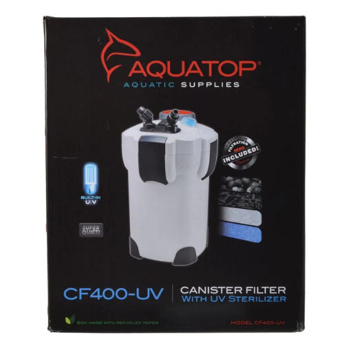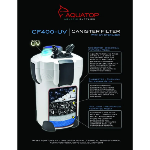Aquatop's CF Canister Filter comes equipped with a built-in UV light to help you achieve a healthy, crystal clear aquarium. Ideal for fresh and saltwater aquariums ranging from 75-125 gallons (CF400) or aquariums up to 175 gallons (CF500).