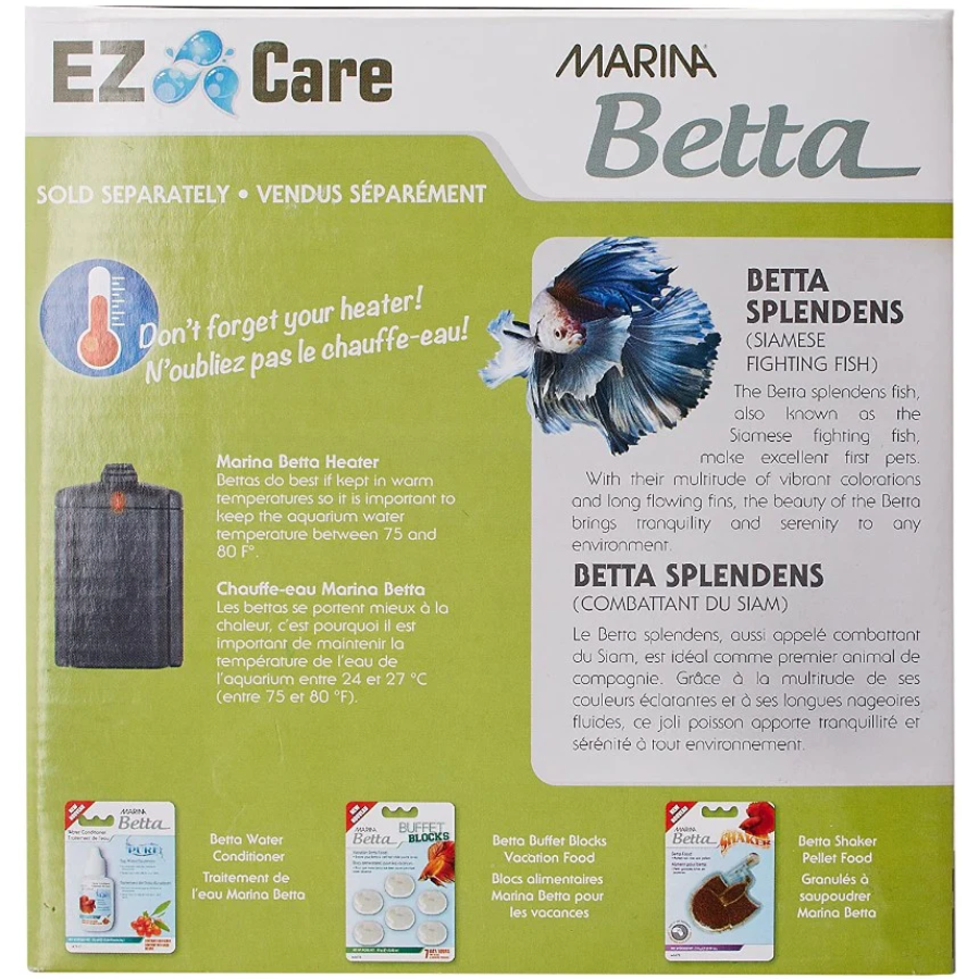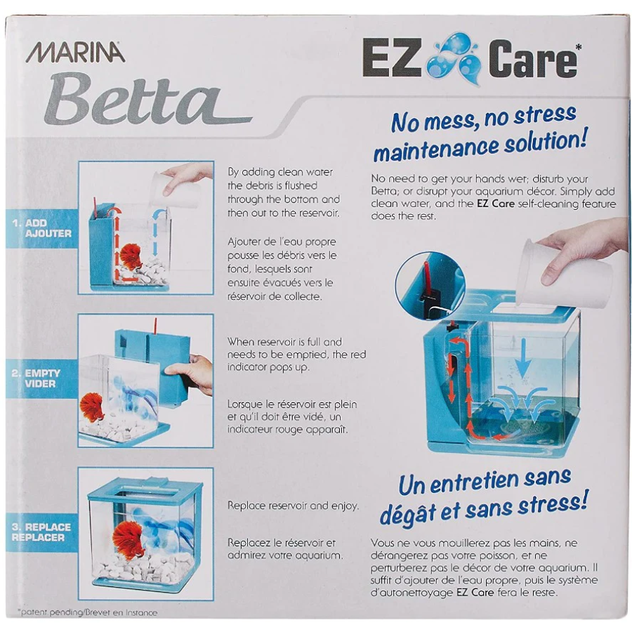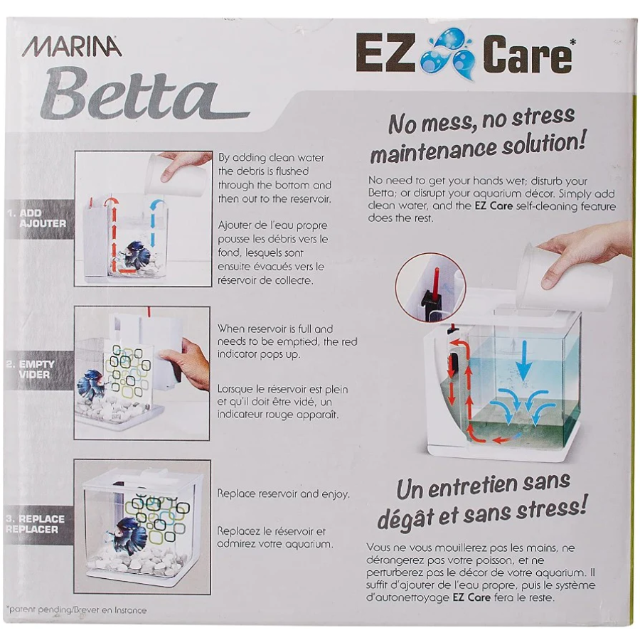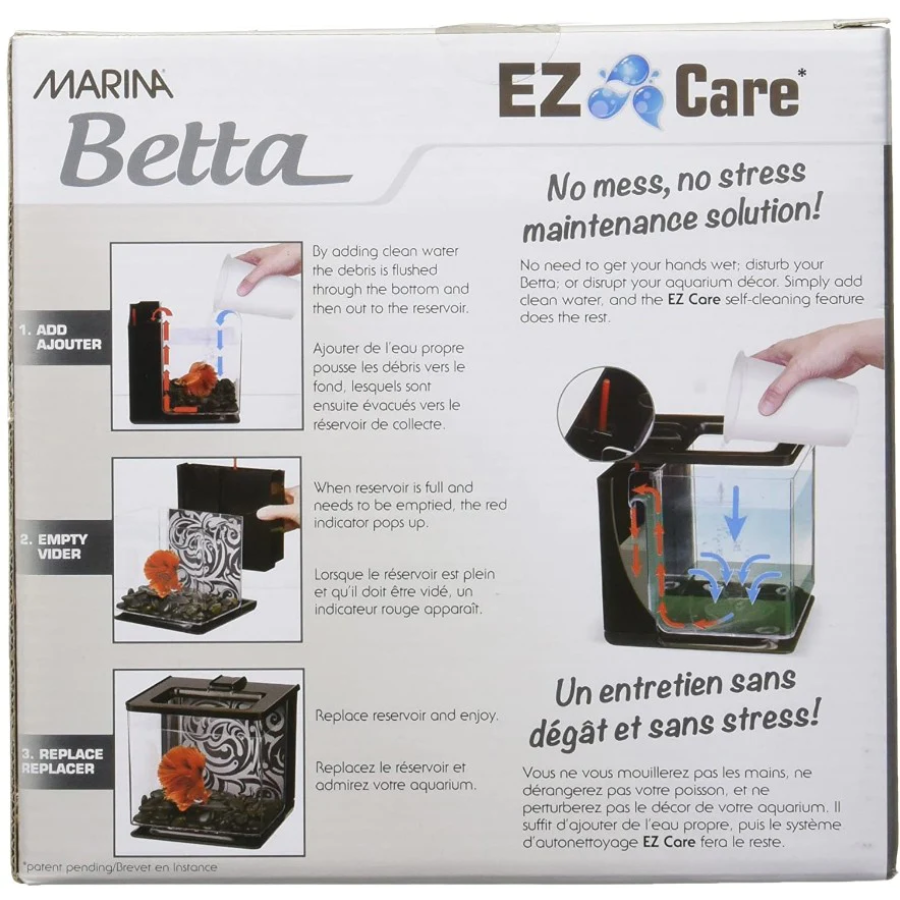 The Marina Betta EZ Care Aquarium provides a no mess, no stress maintenance solution. Now there's no need to get your hands wet; disturb your Betta or disrupt your aquarium decor to perform routine water changes. Simply add clean water and the EZ care self-cleaning feature does the rest. By adding clean water, debris gets flushed to the bottom of the tank and then out to the reservoir located at the back. When the reservoir is filled; just remove, empty, and replace - no mess, no stress. The aquarium's small size takes up very little space and its chic design allows it to blend in nicely with a variety of household or office settings such as counters, desks, bookshelves, or coffee tables.