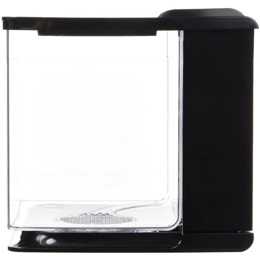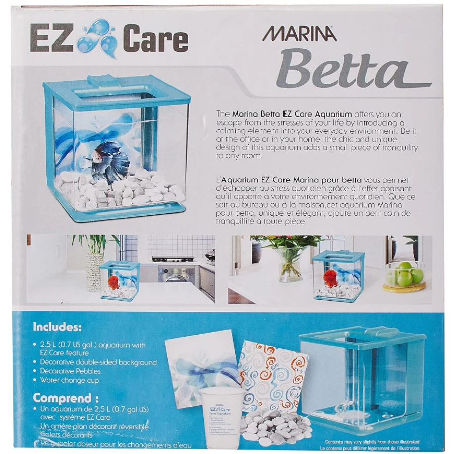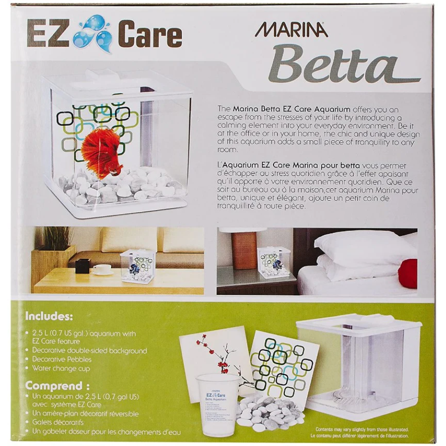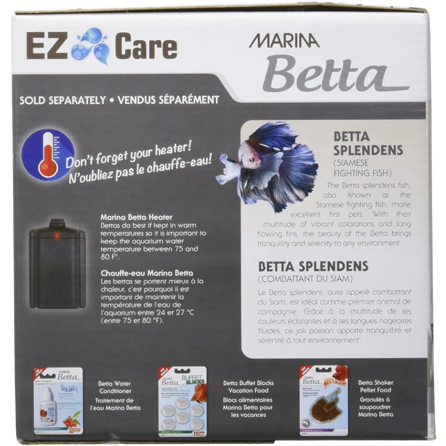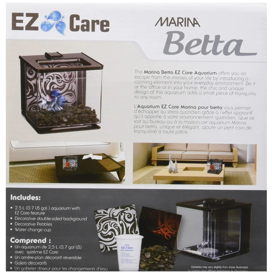 The Marina Betta EZ Care Aquarium provides a no mess, no stress maintenance solution. Now there's no need to get your hands wet; disturb your Betta or disrupt your aquarium decor to perform routine water changes. Simply add clean water and the EZ care self-cleaning feature does the rest. By adding clean water, debris gets flushed to the bottom of the tank and then out to the reservoir located at the back. When the reservoir is filled; just remove, empty, and replace - no mess, no stress. The aquarium's small size takes up very little space and its chic design allows it to blend in nicely with a variety of household or office settings such as counters, desks, bookshelves, or coffee tables.