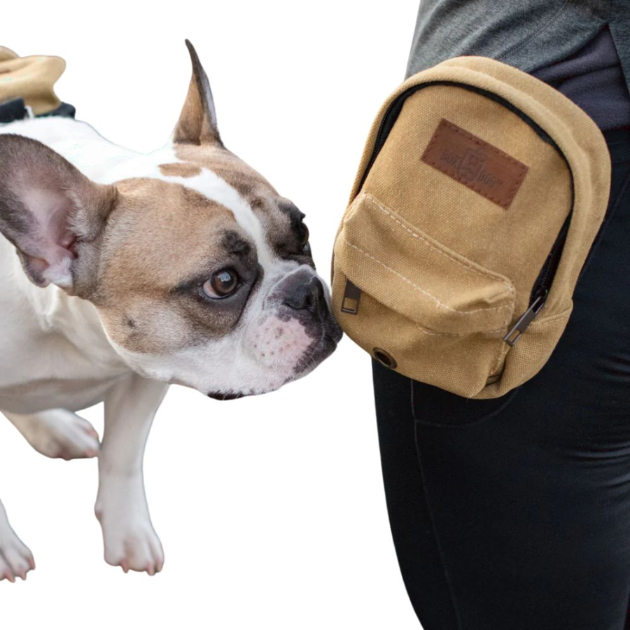Canvas with leather detail in the shape of a small backpack. Can easily hold treats and dog waste bags in separate compartments. Clips to belt or top of pants.