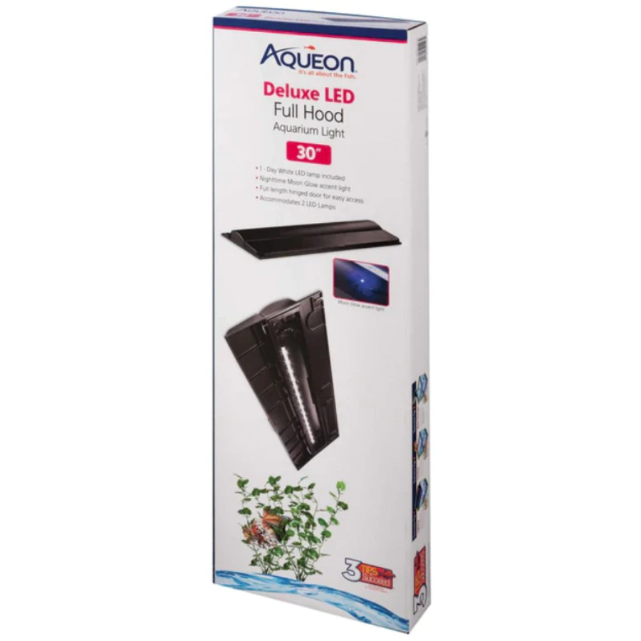 The Aqueon Deluxe LED Full Aquarium Hood provides brilliant, efficient, beautiful illumination for your aquarium in an easy-to-use, adaptable LED light fixture. One long Day White LED Lamp provides crisp brightness, while a Moon Glow Accent Light adds extra character and serenity to your underwater environment.