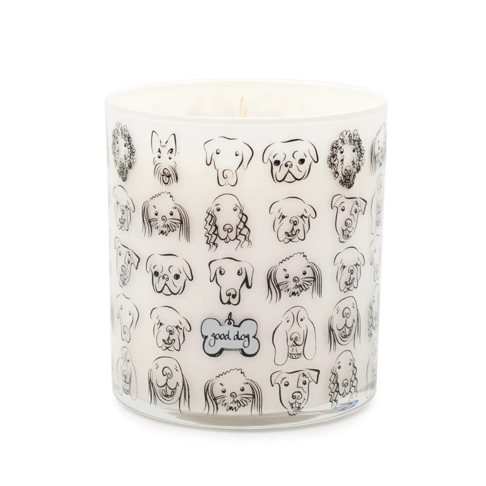 Premium Candle made with a Soy Wax Blend in Odor-Neutralizing Grass Fragrance. It features a bunch of different dog faces around the glass jar with a silver dog tag in the center.