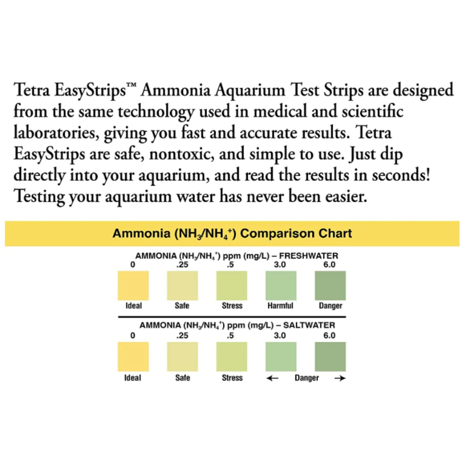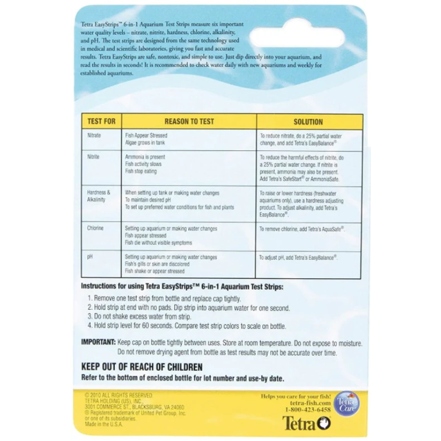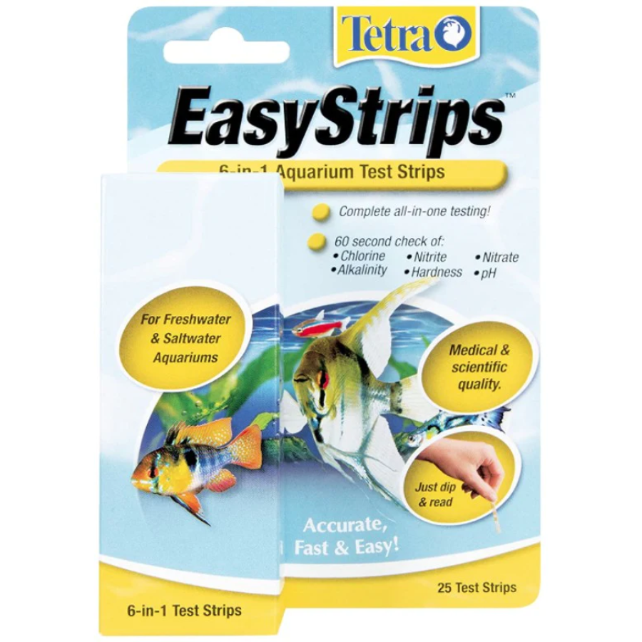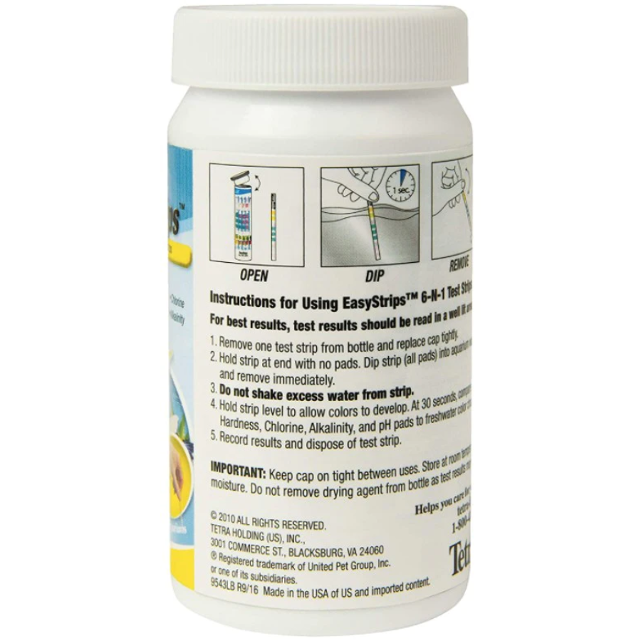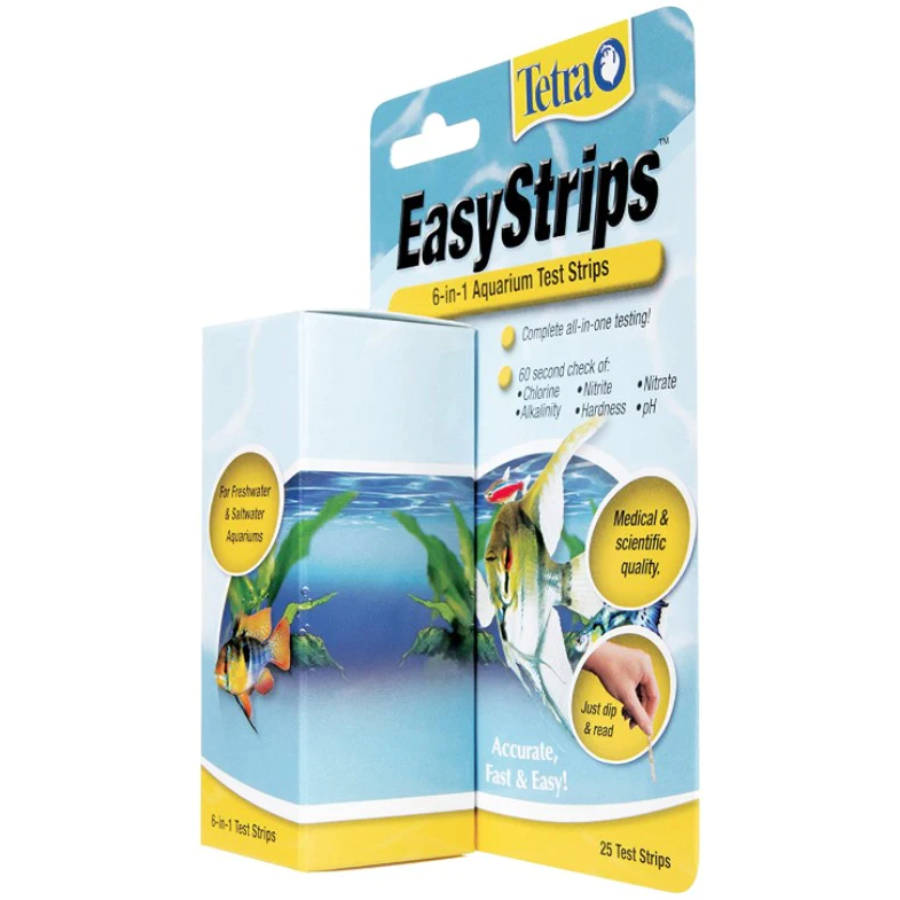 Tetra EasyStrips 6-in-1 Aquarium Test Strips provide complete, all-in-one testing in just 60 seconds. Each strip performs medical and scientific quality tests for pH levels, chlorine, hardness, and harmful toxins. EasyStrips are fast, accurate, easy to read, and suitable for both fresh and saltwater aquariums.