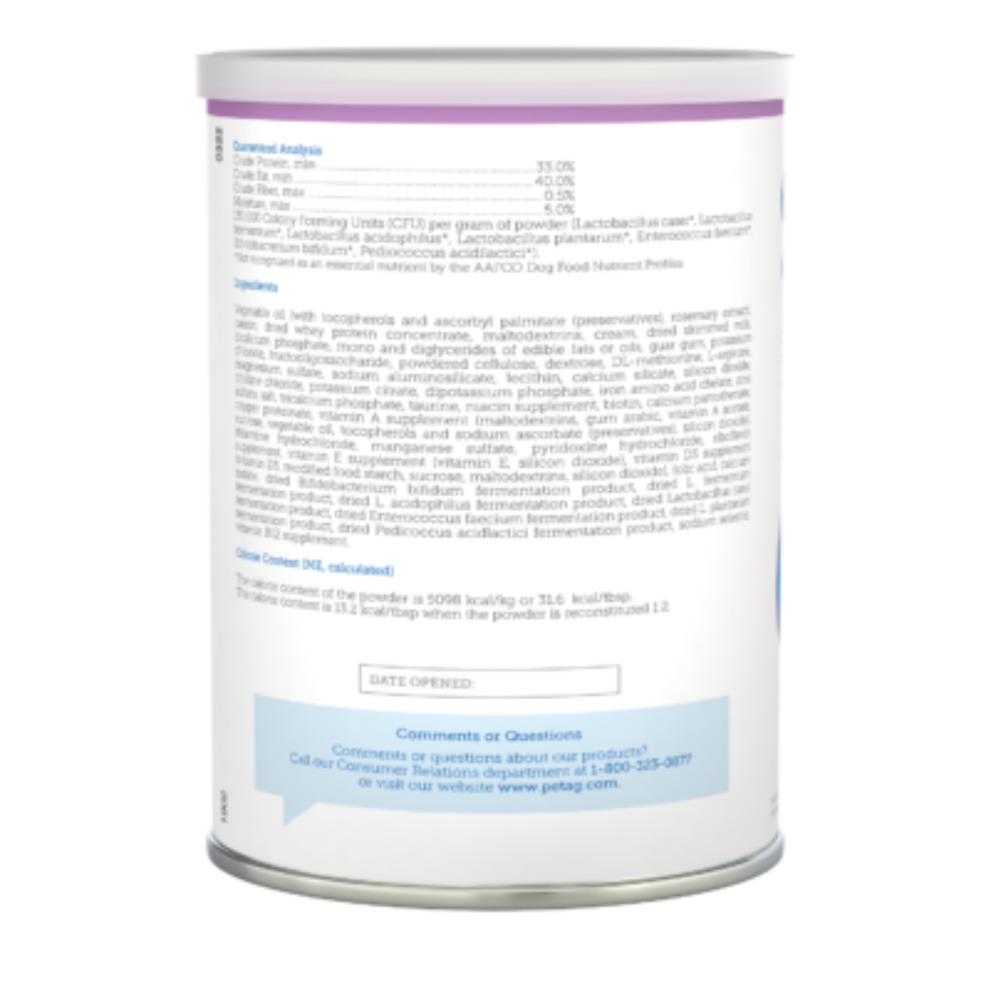 Ingredients: Vegetable oil (with tocopherols and ascorbyl palmitate (preservatives), rosemary extract), casein, dried whey protein concentrate, dried corn syrup, cream, dried skimmed milk, maltodextrins, dicalcium phosphate, mono and diglycerides of edible fats or oils, guar gum, potassium chloride, fructooligosaccharide, powdered cellulose, dextrose, DL-methionine, L-arginine, magnesium sulfate, sodium aluminosilicate, lecithin, calcium silicate, choline chloride, potassium citrate, silicon dioxide, dipotassium phosphate, zinc sulfate, salt, iron amino acid chelate, tricalcium phosphate, taurine, niacin supplement, biotin, calcium pantothenate, vitamin A supplement (vitamin A palmitate, modified food starch, maltodextrins, medium chain triglycerides, BHT (a preservative), sucrose, sodium ascorbate (a preservative), silicon dioxide, disodium EDTA and mixed tocopherols (a preservative)), copper proteinate, thiamine hydrochloride, pyridoxine hydrochloride, riboflavin supplement, manganese sulfate, vitamin E supplement (vitamin E, silicon dioxide), vitamin D3 supplement (vitamin D3, modified food starch, sucrose, maltodextrins, silicon dioxide), folic acid, calcium iodate, dried Lactobacillus casei fermentation product, dried L. fermentum fermentation product, dried L. acidophilus fermentation product, dried L. plantarum fermentation product, dried Enterococcus faecium fermentation product, dried Bifidobacterium bifidum fermentation product, dried Pediococcusacidilactici fermentation product, sodium selenite, vitamin B12 supplement