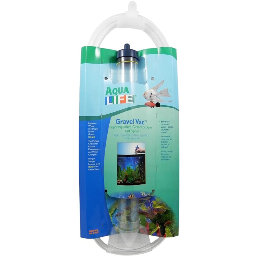 A super aquarium cleaner, scraper, and siphon all-in-one. This Gravel Vac by Penn Plax is designed for the removal of grungy waste, dirt layers, and debris from the gravel bed at the bottom of your aquarium. The vacuum features a unique scraper that reaches below the gravel line for a proper glass cleaning, without scratching the glass. The gravel vacuum also features an easy-to-use self-starting siphon for easy routine maintenance of your fish tank.