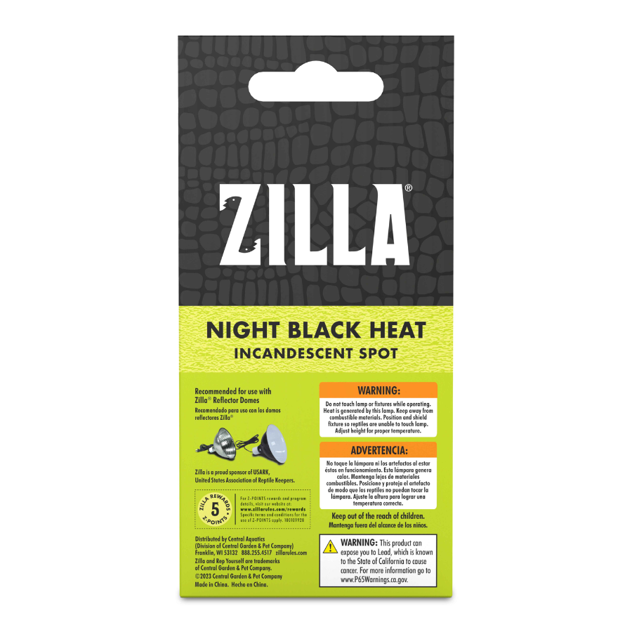 Zilla® Incandescent Spots pinpoint light and heat in any area for a more dramatic visual effect. Spot heat lamps create focused warm zones, allowing reptiles to move away from the heat source as their body temperature changes. Heavy-duty filaments yield more hours of service from every bulb.