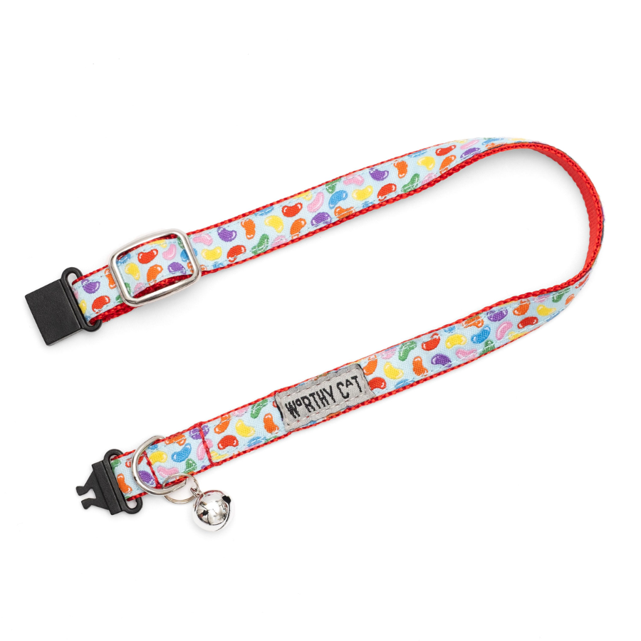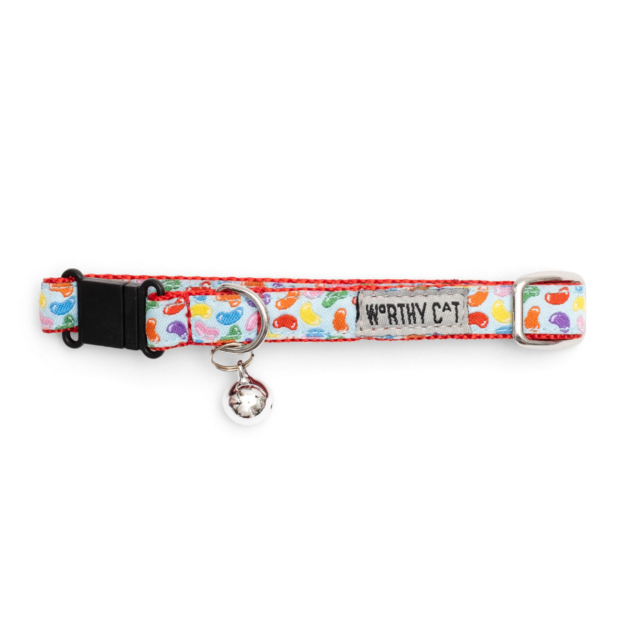 The Worthy Dog's cat collars combine fashion and function! Featuring woven ribbon sewn onto soft, comfortable and durable nylon webbing, nickel plated D-ring to attach tags, and a removable bell that serves double duty: helping you keep track of kitty while also alerting nearby wildlife to your pet's presence. A breakaway snap clasp keeps cats safe, snapping open if snagged. Adjustable for a perfect fit!