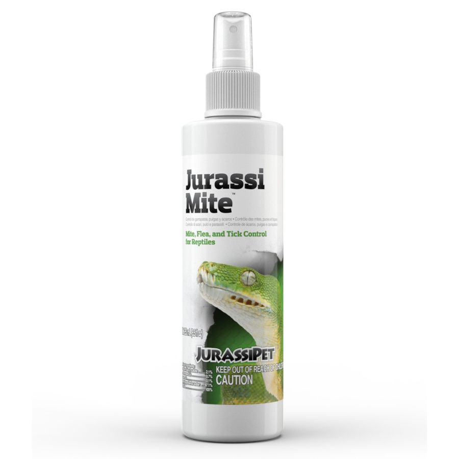 JurassiPet JurassiMite™ utilizes a formula that, when used as directed, safely and effectively controls common reptile parasites such as mites, fleas, and ticks. Mite infestations are notoriously difficult to get rid of. When the enclosure is infested as well (as is often the case), the task becomes even harder. It requires persistence and close attention. Under most circumstances a single treatment of any mite-removal product will unlikely be sufficient. Infestations may quickly rebound during long multi-day intervals between treatment. However, due to its formulation, JurassiMite™ can be used as frequently or infrequently as needed.