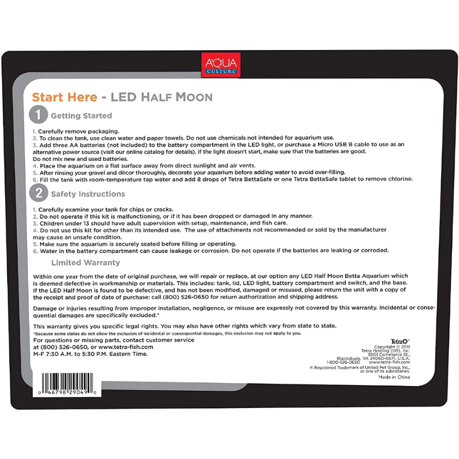 The LED lights are powered by three AA batteries (not included) and can also be powered using a micro USB B Cable with AC adapter (not included) to plug the unit into any outlet. With plenty of versatility with lighting options and a unique style, this great half moon LED kit is perfect for your betta fish!