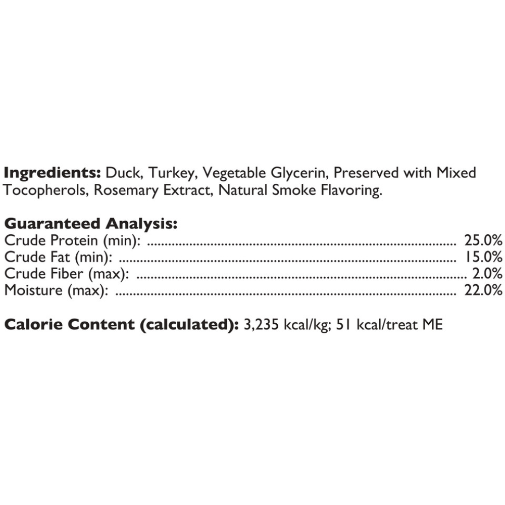 Duck, Turkey, Vegetable Glycerin, Natural Smoke Flavor, Rosemary Extract, Preserved with Mixed Tocopherols.