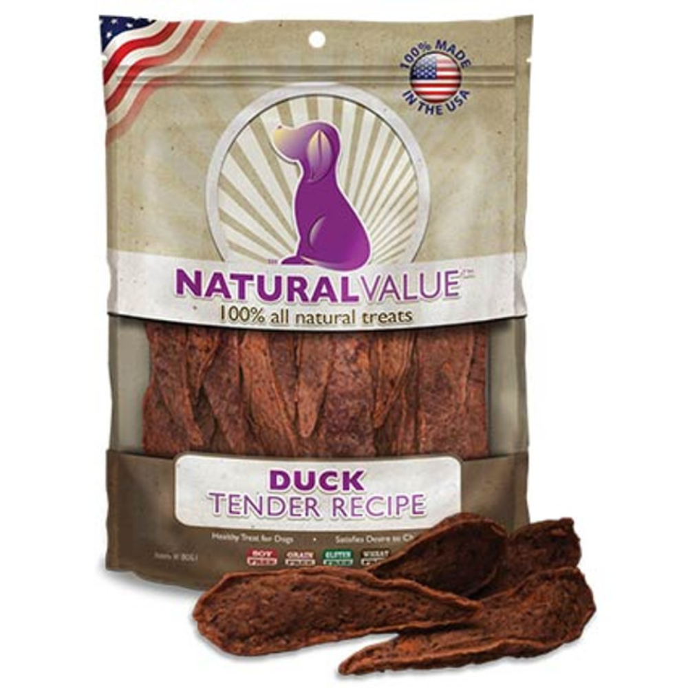 Natural Value® duck tender dog treats are perfect for any size or age dog. Free of by-products, preservatives, gluten, soy, corn and wheat, our duck tenders prove that you have low-cost options when it comes to healthy, USA-made dog treats. Soft chew duck tender snacks for dogs let you customize each bonding moment with easy-to-break-apart texture. You can use these treats to help train your pet, calm them or show them affection. The perfectly balanced flavors and chewy textures of these U.S.-made duck tenders will get your pup's tail wagging every time.