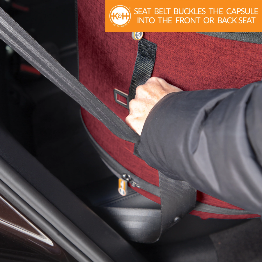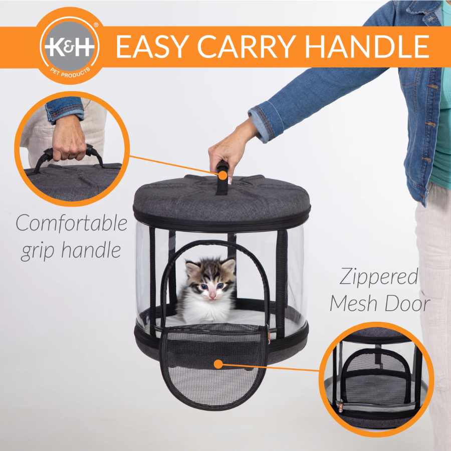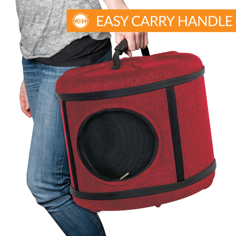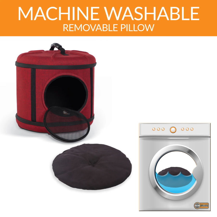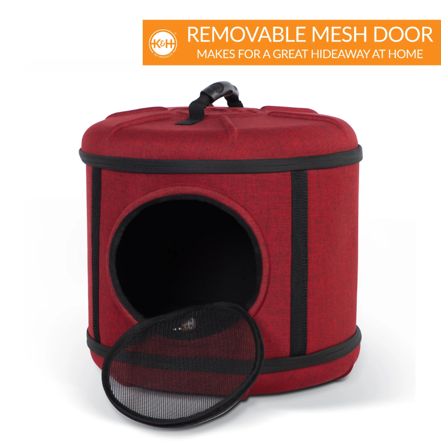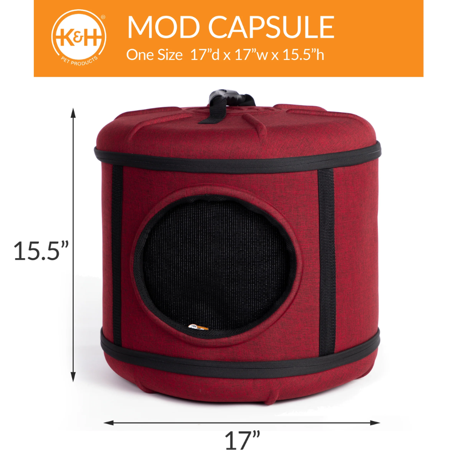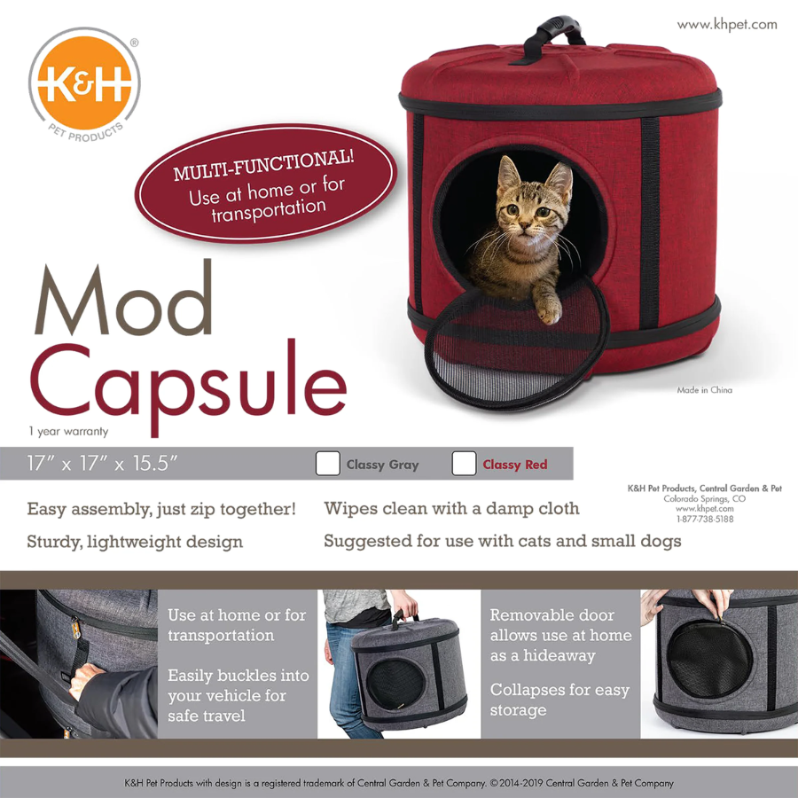 Not only is the Mod Capsule a bed and a playhouse, but it’s also a convenient pet carrier making it a value that every cat owner will love. It simply zips together for easy assembly. The mesh door is completely removable (clear model unzips but is not removable) for use as a sleeper. Just zip the door back on for use as a transport carrier for trips to and from the vet or for travel. It has a sturdy carrying handle and easily straps into vehicles to transport pets safely. Includes a comfortable, washable pillow.