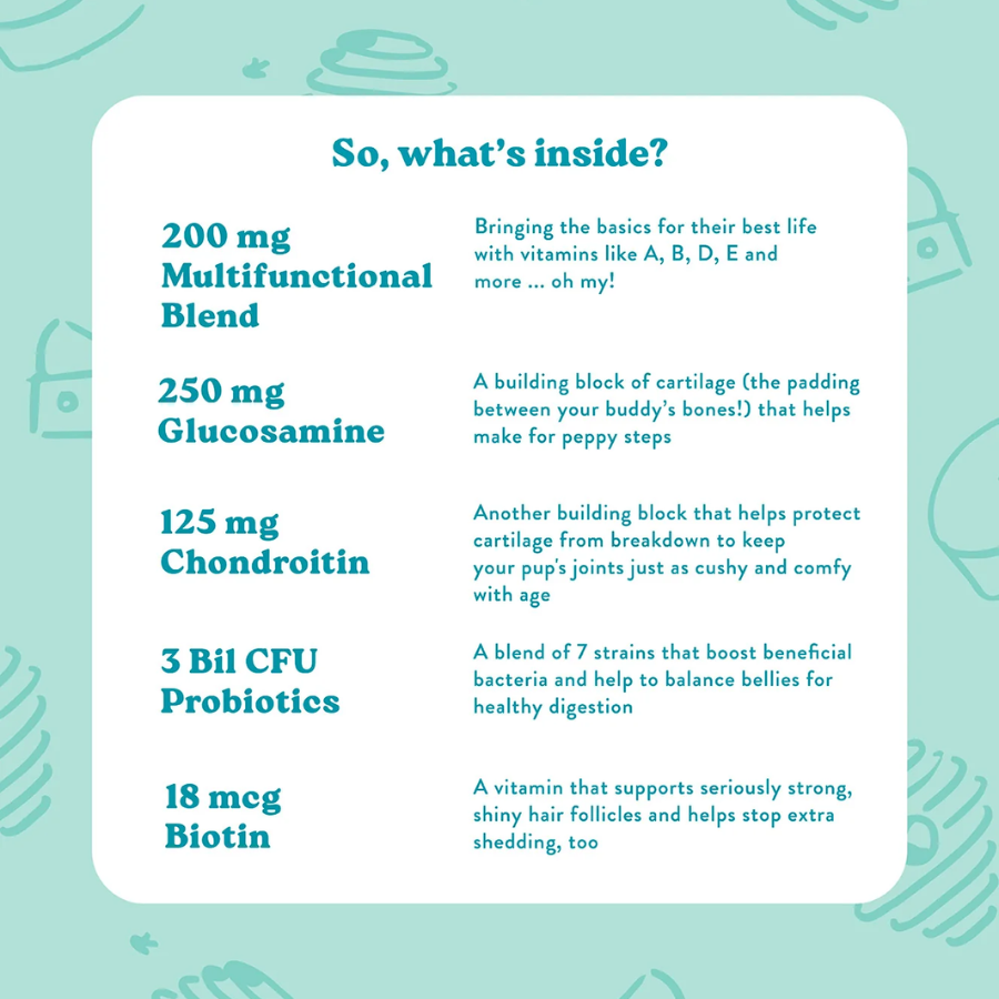 Ingredients: Oat Flour, Dried Cheese Powder, Ground Flaxseed, Palm Oil, Glucosamine Hydrochloride, Niacin Supplement (Vitamin B3), Vitamin E Supplement, Vitamin A Supplement, Thiamine Mononitrate (Vitamin B1), Mineral Oil, Pyridoxine Hydrochloride (Vitamin B6), d-Calcium Pantothenate (Vitamin B5), Riboflavin Supplement (Vitamin B2), Vitamin D3 Supplement, Biotin (Vitamin H), Vitamin B12 Supplement, Folic Acid (Vitamin B9), Salmon Oil, Microcrystalline Cellulose Powder, Honey, Chondroitin Sulfate, Sunflower Lecithin, Coconut Glycerin, Dried Lactobacillus acidophilus Fermentation Product, Dried Bifidobacterium bifidum Fermentation Product, Dried Lactobacillus lactis Fermentation Product, Dried Lactobacillus plantarum Fermentation Product, Dried Lactobacillus brevis Fermentation Product, Dried Enterococcus faecium Fermentation Product, Dried Lactobacillus fermentum Fermentation Product, Sorbic Acid (preservative), Mixed Tocopherols (preservative) and Rosemary Extract