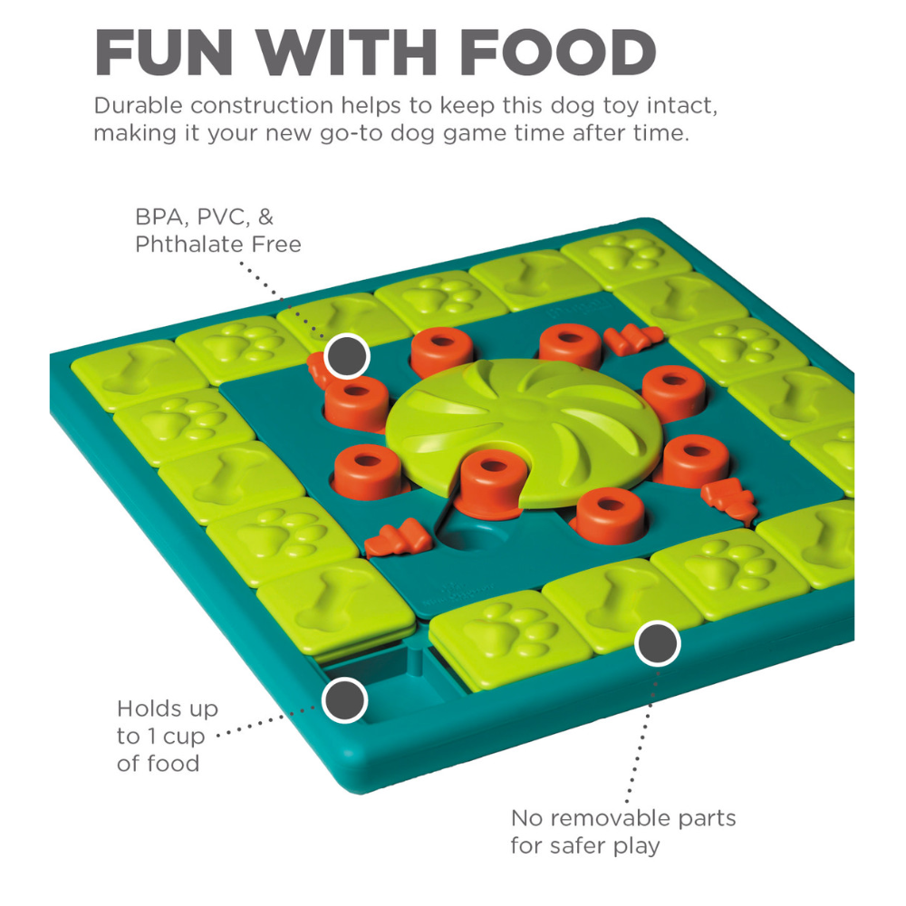 - 4 challenges, 1 puzzle: The level of difficulty of the MultiPuzzle can be adjusted as your dog learns! Between the moveable green tiles, spinning wheel, orange locks, and center sliders, your pup will stay busy working for those treat for a good while!