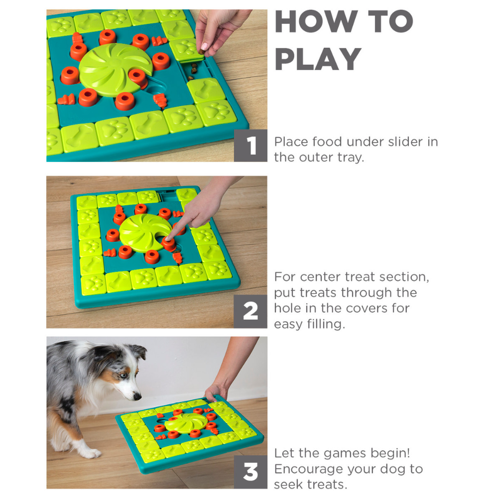 SAFETY AND CARE: ALWAYS SUPERVISE your dog closely, teach your dog how the game works. Do not leave your dog alone with a treat puzzle, do not let your dog chew on the game or pieces. Inspect for damage and remove if broken. For dogs only, not a children’s toy. When empty, store until next supervised use.