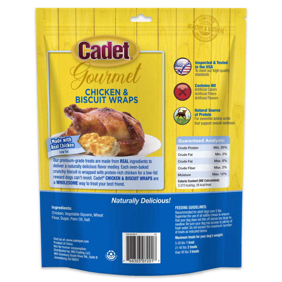 Cadet Gourmet Chicken & Biscuit Wraps are full of the wholesome ingredients dogs love! Made with real, premium-quality chicken that's wrapped around a crunchy dog biscuit, these chicken treats are deliciously entertaining. Keeping wellness in mind, these healthy dog treats are naturally low in fat and contain no artificial or flavors. These wholesome bites are the perfect way to treat your best friend.