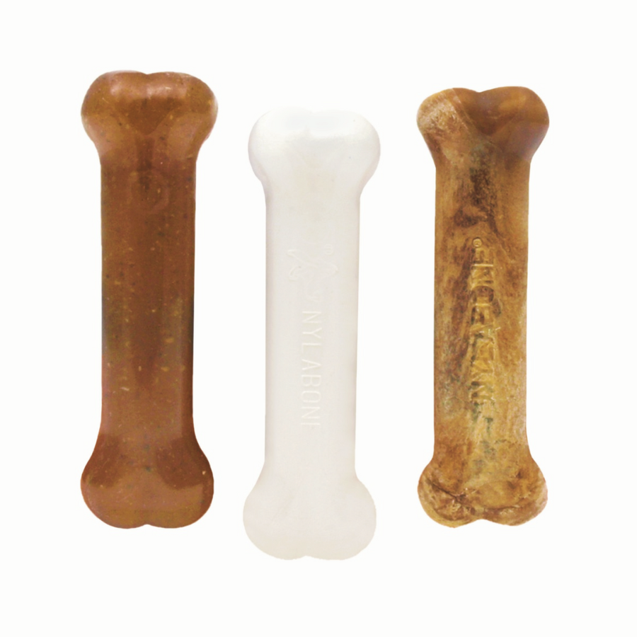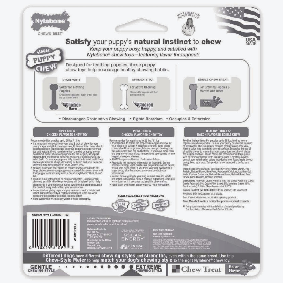 The Puppy Starter Kit includes two puppy toys and an edible chew treat perfect for every developmental stage: a soft plastic Puppy Chew Bone for teething puppies before they get any permanent teeth; a Power Chew chicken-flavored bone for puppies starting to get their permanent teeth; and a Healthy Edibles bacon-flavored chew treat recommended for puppies 6 months and older. Each chew encourages proper chewing habits and helps discourage destructive chewing from a young age. Plus, they promote dental health by reducing plaque and tartar as your dog chews. You can feel good about rewarding your new best fur friend with these veterinarian- recommended puppy chew toys that are proudly made in the USA!