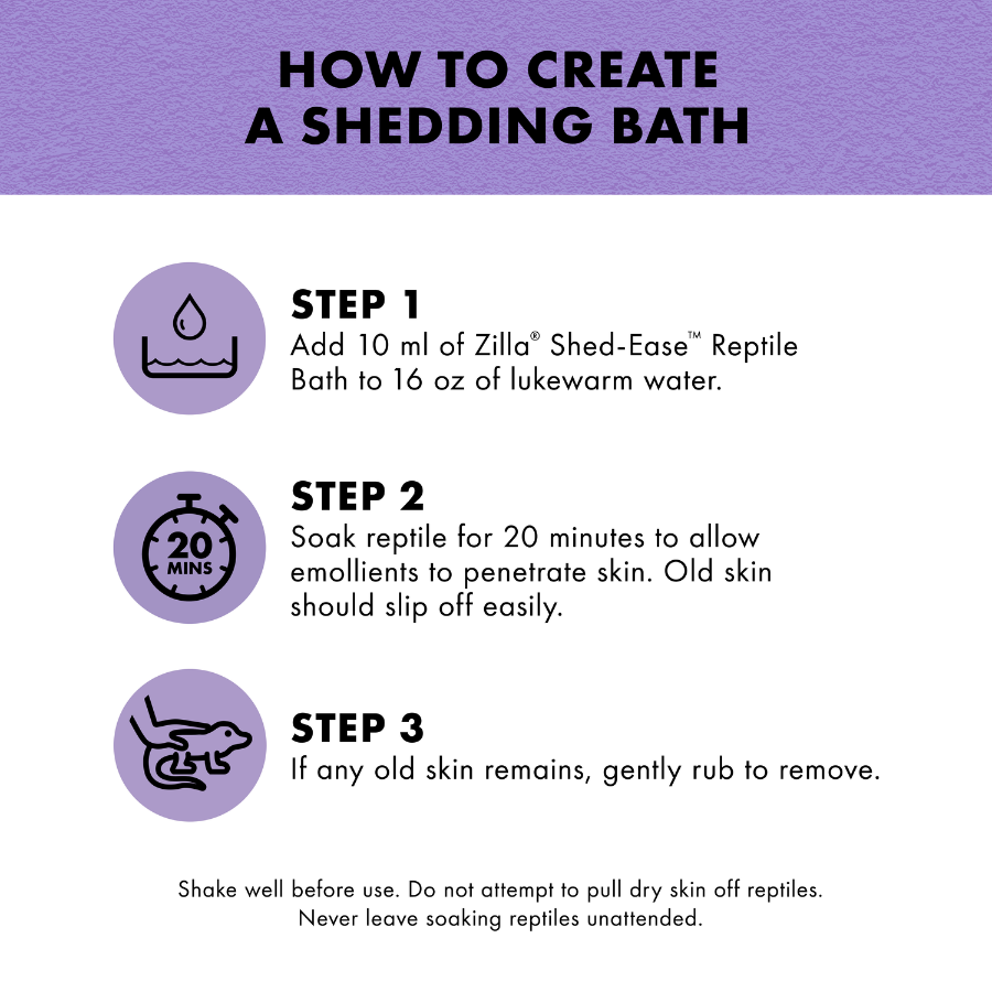 - EASY TO USE by simply adding 10 ml of Zilla Shed-Ease Reptile Bath to 16 oz of lukewarm water. Allow reptile to soak for 20 minutes. Old skin should slip off easily.