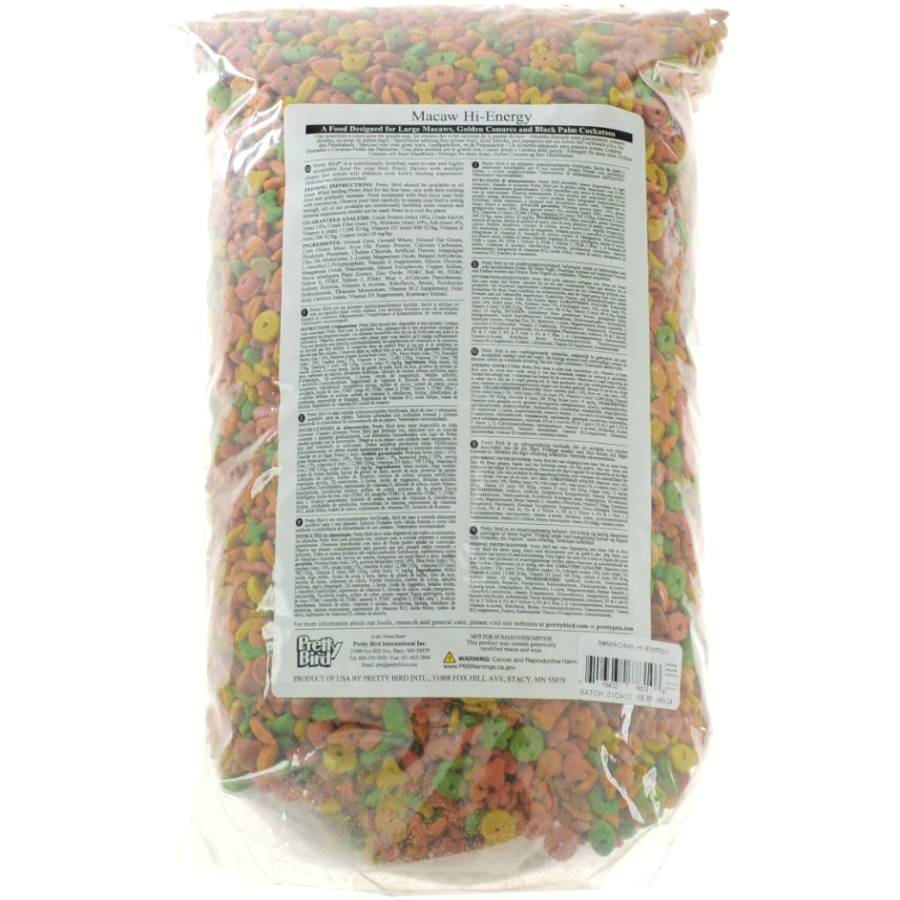 Pretty Bird Species Specific Hi Energy Macaw food is designed for species that require high fat levels such as Macaws, Golden Conures, and Black Palm Cockatoos. This food contains all the proper vitamins and minerals to give these birds a complete and balanced diet.