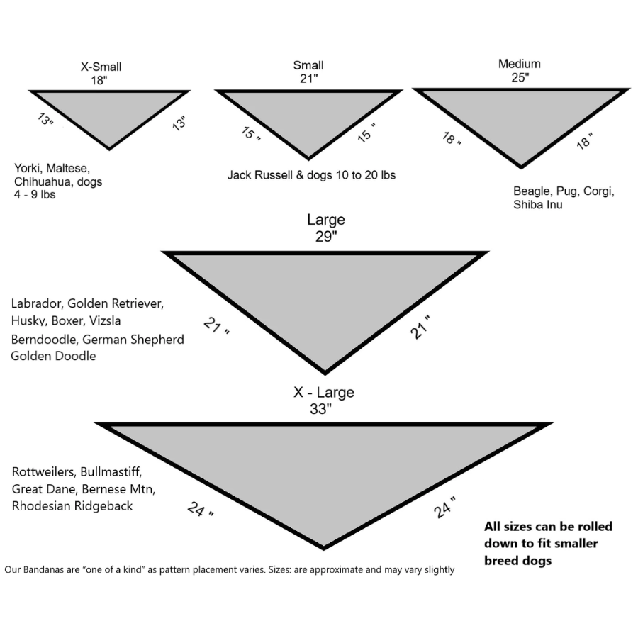 How to Use: For large dogs just tie around neck, smaller dogs roll down the top edge to make smaller and tie around neck, leaving a few inches for comfort. Wear bandana in front of chest or to the side or laying on dogs back – you choose the look!