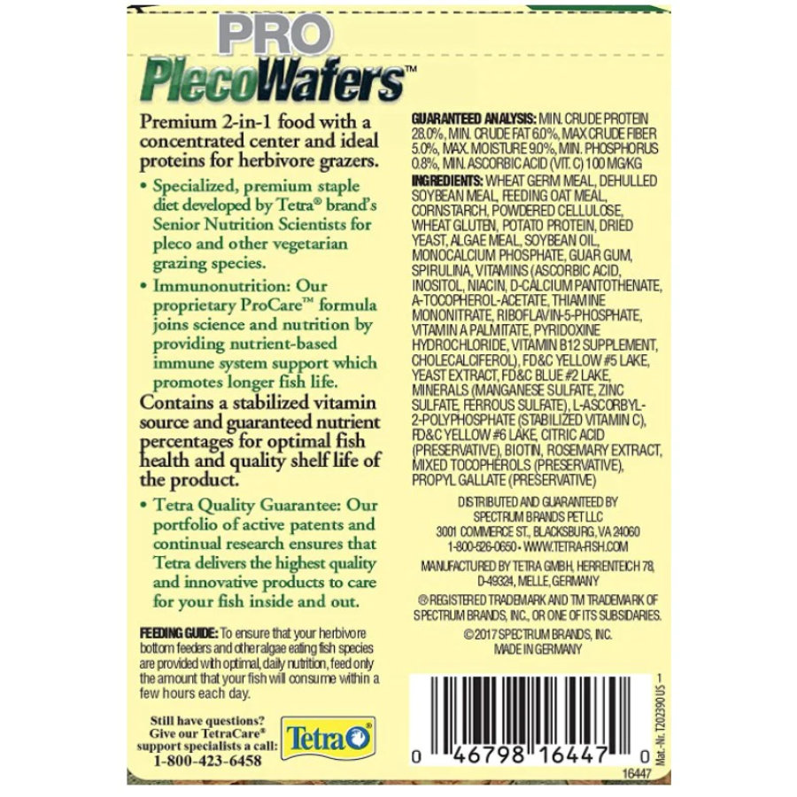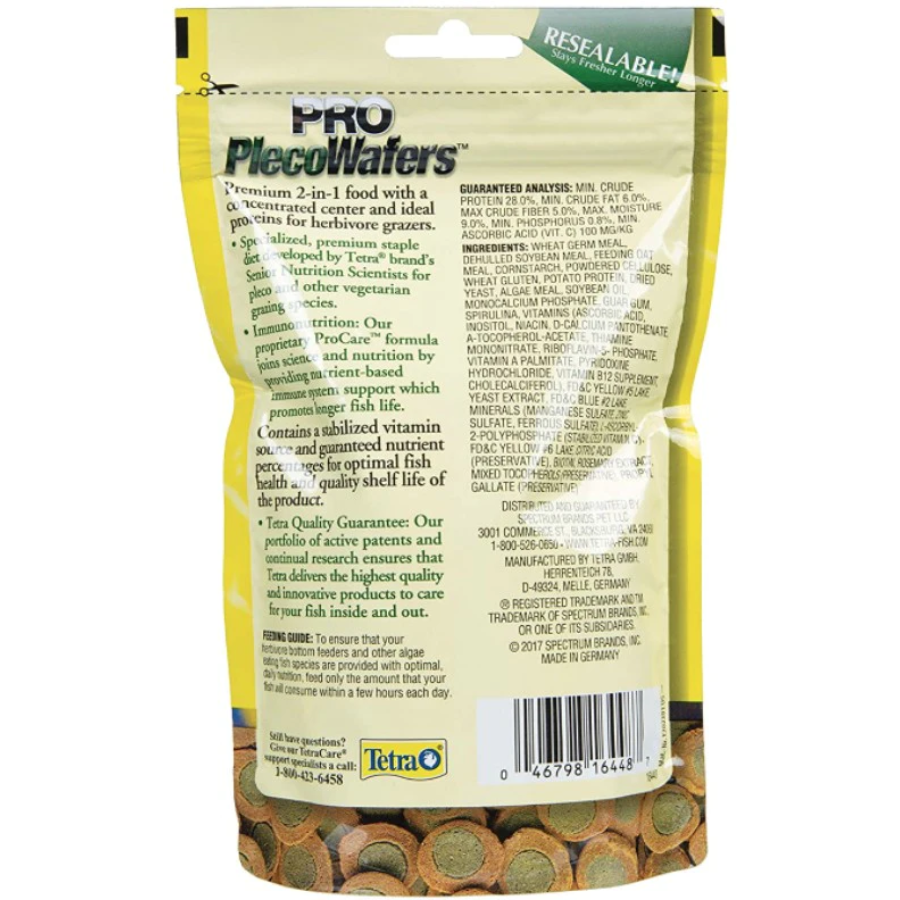 Tetra Pro Pleco Wafers are a complete diet for algae eaters, such as sucker mouth catfish (including Plecostomus) and other bottom feeders. This 2-in-1 food contains a highly nutritious, vegetable-enriched algae center surrounded by an easily digested sinking wafer.