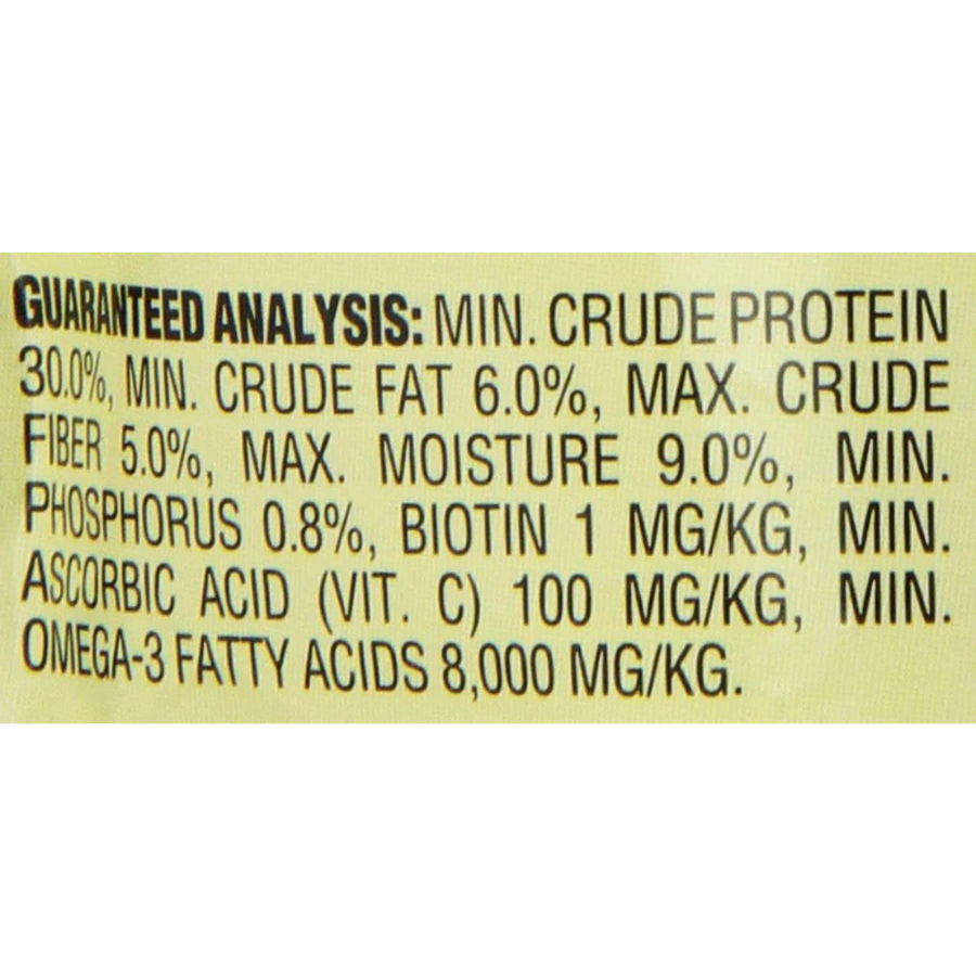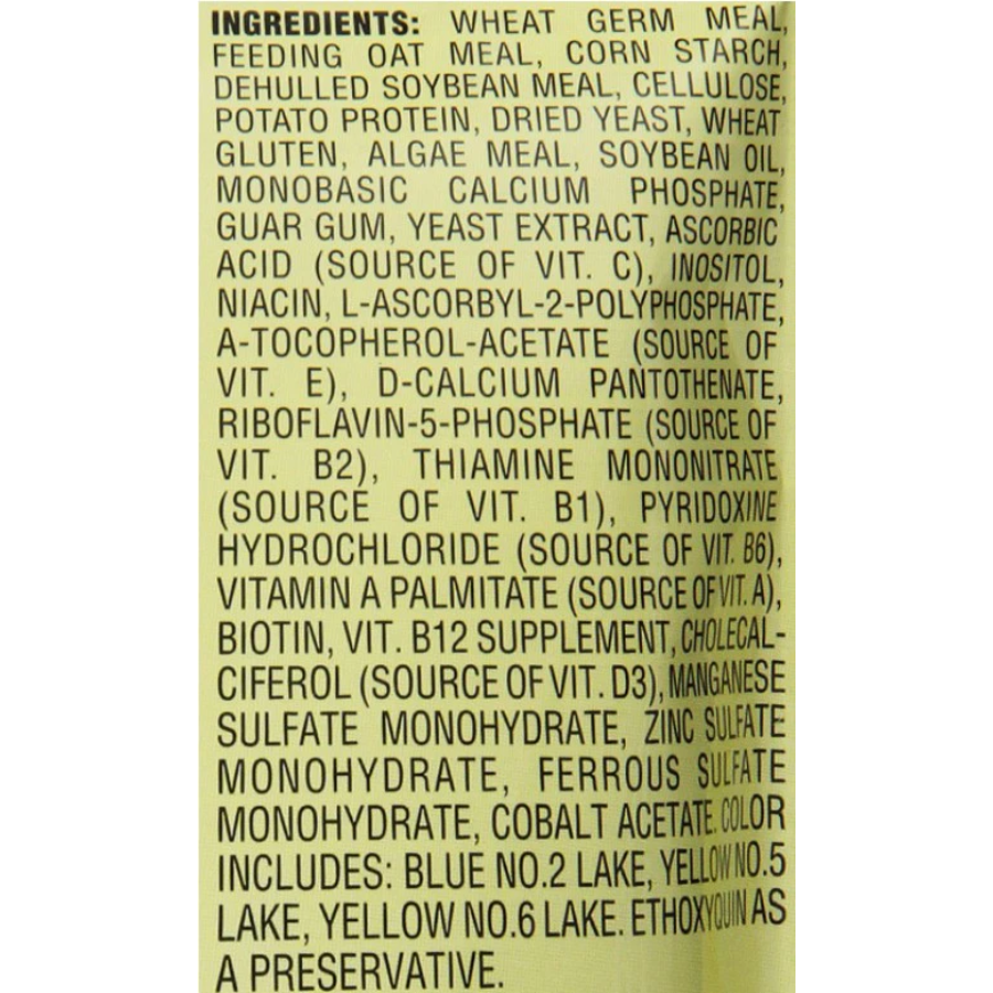 Ingredients: Wheat Germ Meal, Dehulled Soybean Meal, Feeding Oat Meal, Cornstarch, Powdered Cellulose, Wheat Gluten, Potato Protein, Dried Yeast, Algae Meal, Soybean Oil, Monobasic Calcium Phosphate, Guar Gum, Ascorbic Acid (source of Vitamin C), Yellow 5 Lake, Blue 2 Lake, Yellow 6 Lake, Yeast Extract, Inositol, Niacin, Manganese Sulfate, Zinc Sulfate, Ferrous Sulfate, Ethoxyquin (preservative), L-Ascorbyl-2-Polyphosphate (source of Vit. C), A-Tocopherol-Acetate (source of Vit. E), D-Calcium Pantothenate, Riboflavin (source of Vit. B12), Thiamine Mononitrate (source of Vit. B1), Pyridoxine Hydrochloride (source of Vit. B6), Vitamin A Palmitate (source of Vit. A), Biotin, Vitamin B12 Supplement, Cholecalciferol (source of Vit. D3).