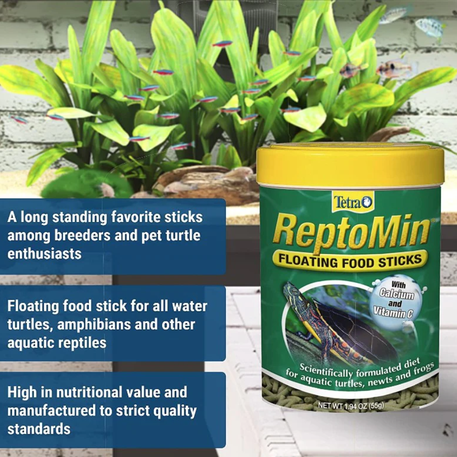 Tetrafauna ReptoMin is a long-standing favorite among breeders and pet turtle enthusiasts alike. ReptoMin Floating Food Sticks provide excellent nutrition and high palatability, and are great for all water turtles, amphibians and other aquatic reptiles.