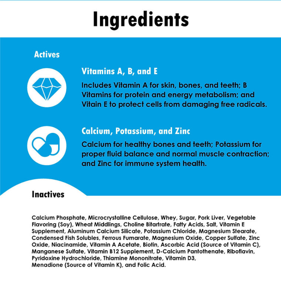 Vita-Tabs provide your dog with the essential vitamins, minerals, and nutrients your pet needs for important structures and most daily functions within their bodies. Unlike other pet vitamins, Vita-Tabs contain 8 minerals and 16 vitamins, providing your pet with more health benefits in one liver flavored chewable tablet. The liver base provides a quality source of protein and flavor dogs enjoy.