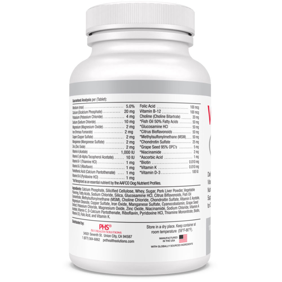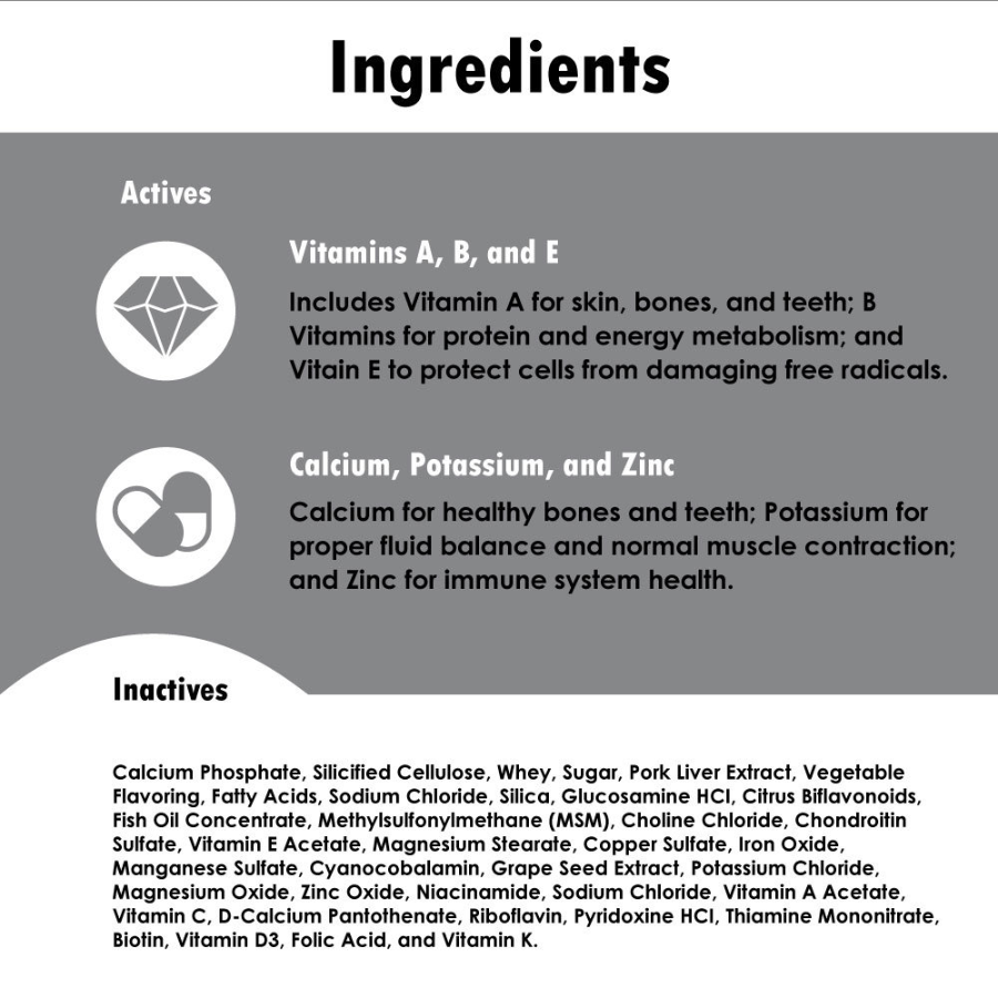 Calcium Phosphate, Silicified Cellulose, Whey, Sugar, Pork Liver Extract, Vegetable Flavoring, Fatty Acids, Sodium Chloride, Silica, Glucosamine HCI, Citrus Biflavonoids, Fish Oil Concentrate, Methylsulfonylmethane (MSM), Choline Chloride, Chondroitin Sulfate, Vitamin E Acetate, Magnesium Stearate, Copper Sulfate, Iron Oxide, Manganese Sulfate, Cyanocobalamin, Grape Seed Extract, Potassium Chloride, Magnesium Oxide, Zinc Oxide, Niacinamide, Sodium Chloride, Vitamin A Acetate, Vitamin C, D-Calcium Pantothenate, Riboflavin, Pyridoxine HCI, Thiamine Mononitrate, Biotin, Vitamin D3, Folic Acid, and Vitamin K.